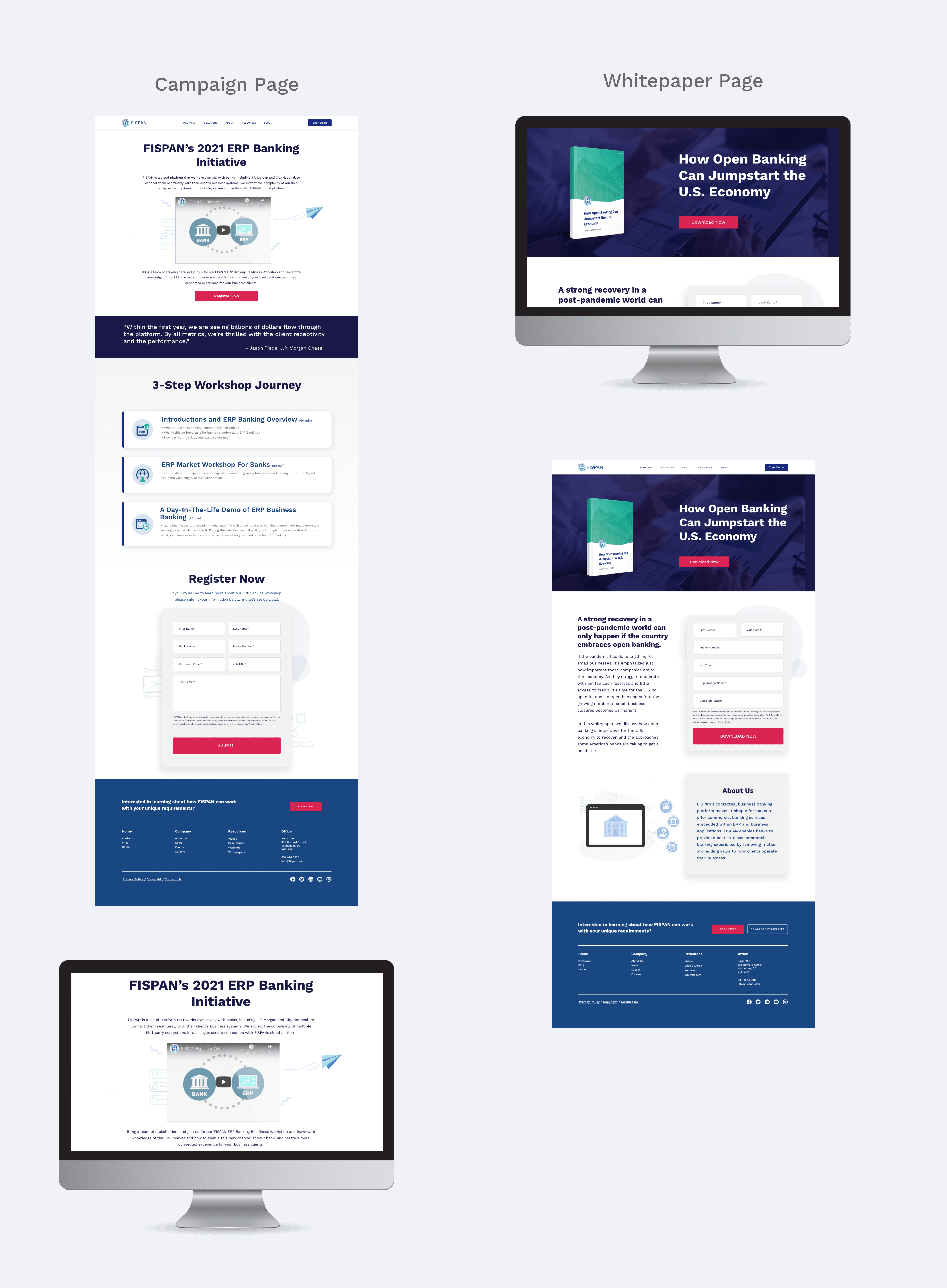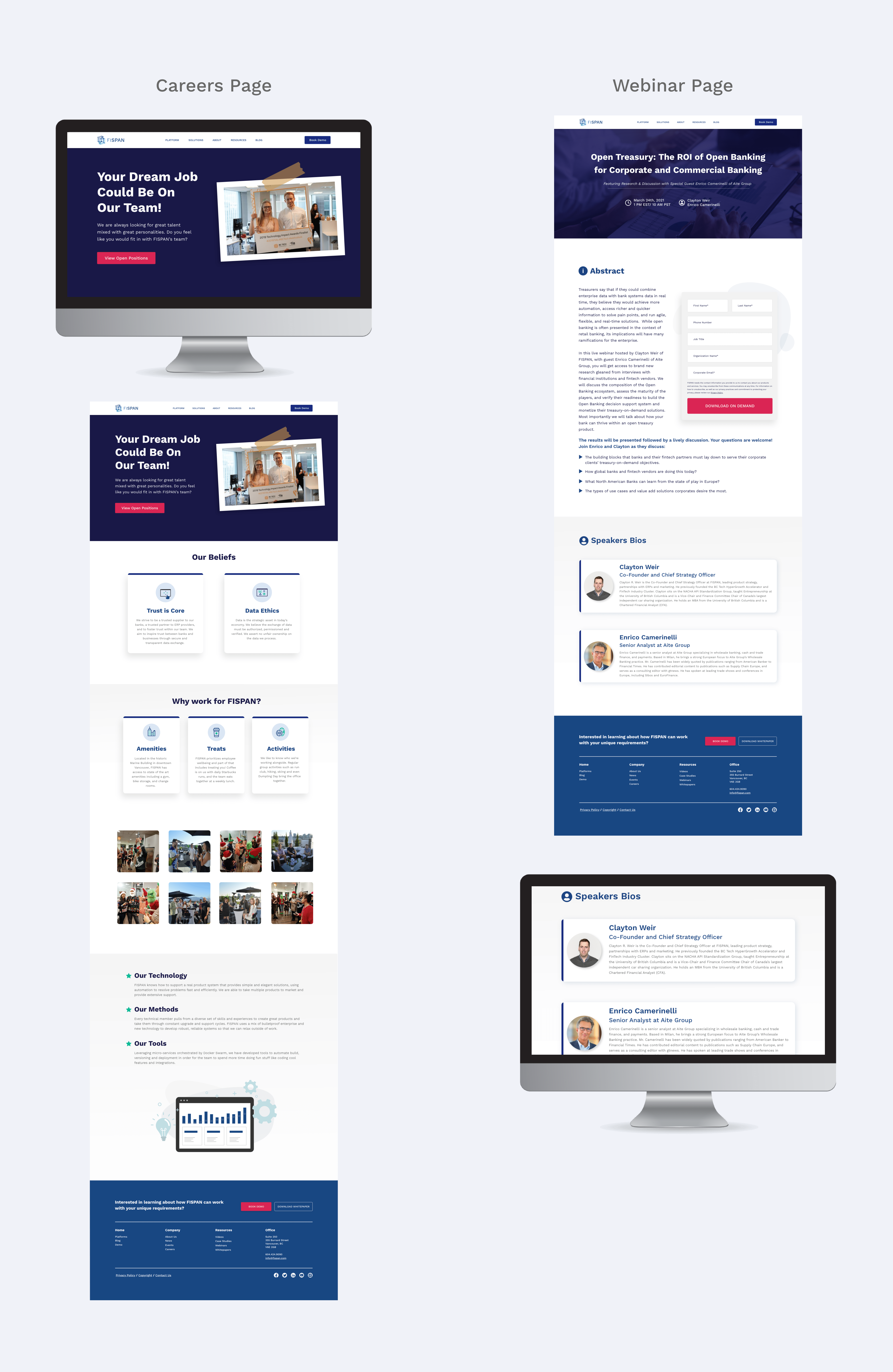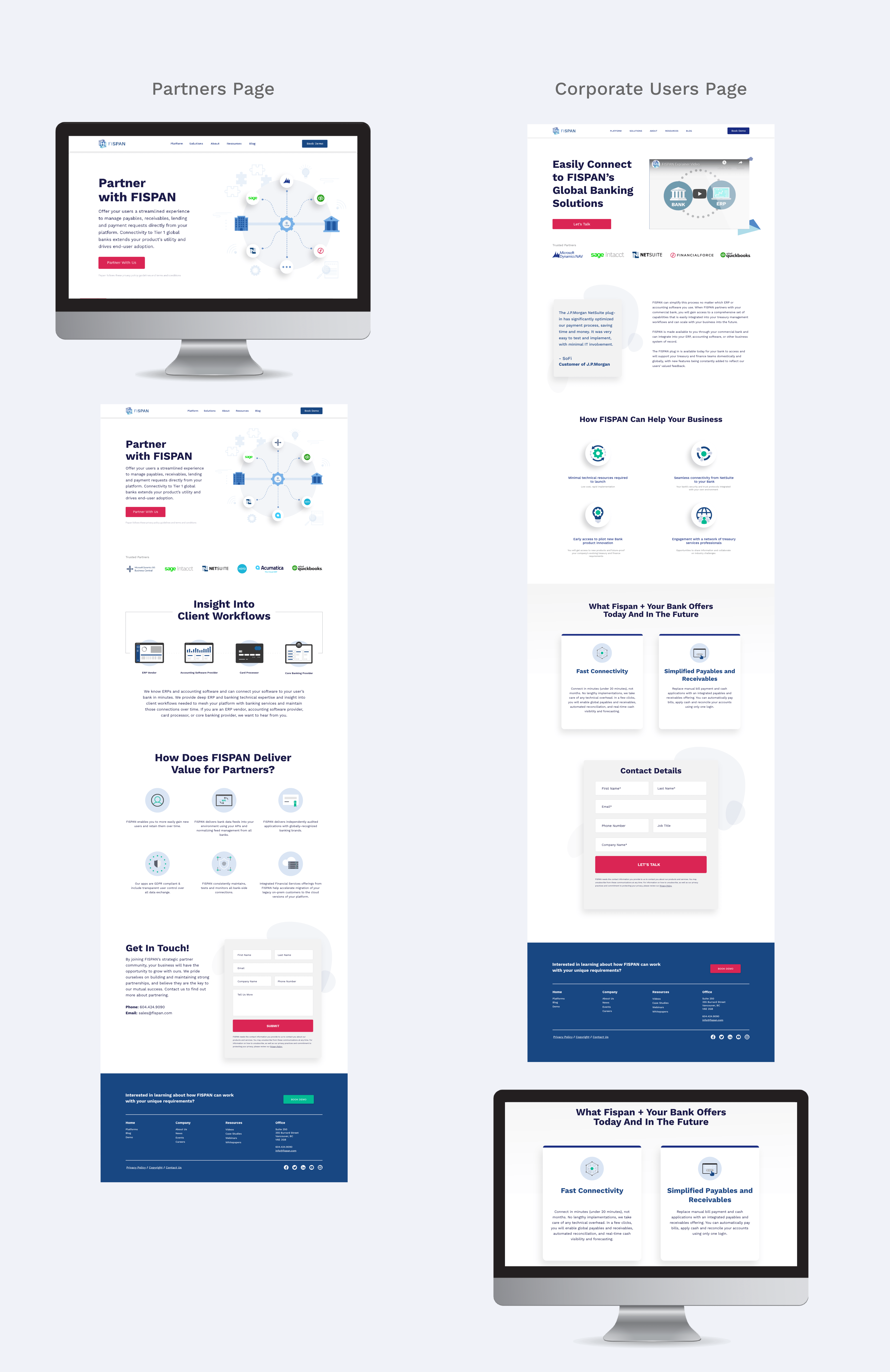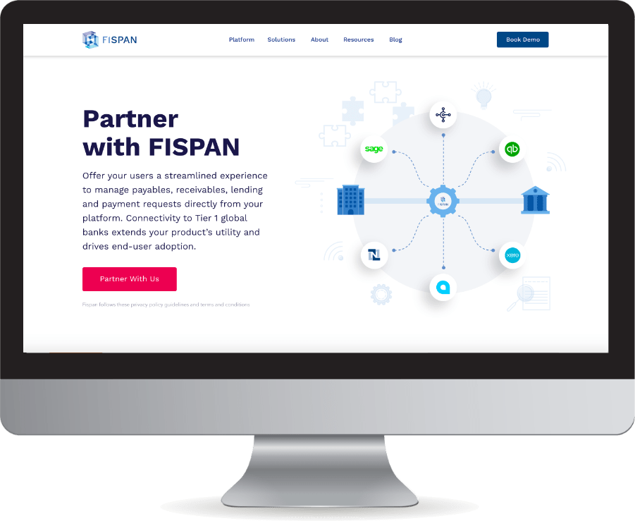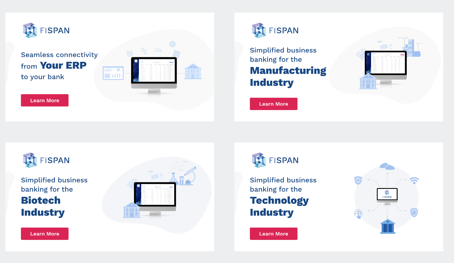 Feature pages that focus on FISPAN technical capabilities utilize custom illustrations of core features in combination with ERP or Banking systems. Where possible, pull out specific panels to create visual interest vs plain screenshots of technical systems.